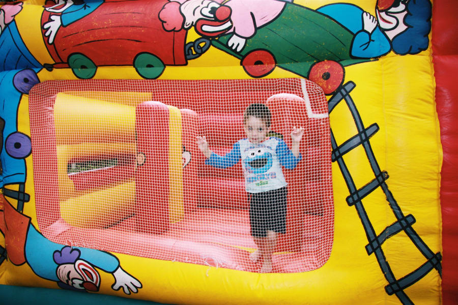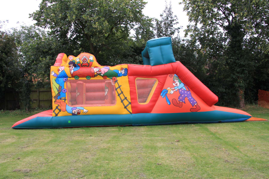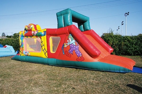 The picture of our fun run speaks for its self FUN FUN FUN! It has an opening at one end where the children need to climb through before tackling the bish bash pillars, then the children climb up the steps before sliding down. Children never disappointed with this inflatable.