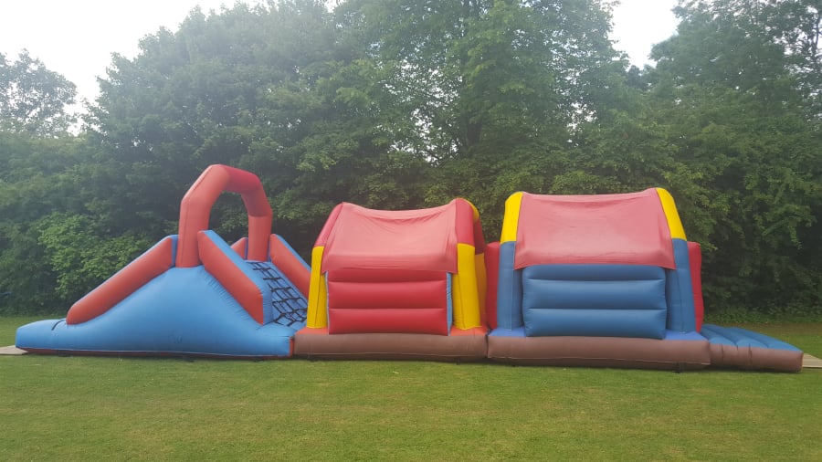 This unit is a 3 piece Assault Course (predominately coloured in red, yellow & brown) which is suitable for children from the age of 3 upto mid teens. There are numerous activities throughout including a bish & bash area, climbing, jumping, bouncing & sliding. It will certainly keep the children busy and active. To book please contact by phone to avoid disappointment. Two pieces of the unit are covered, the slide is uncovered.